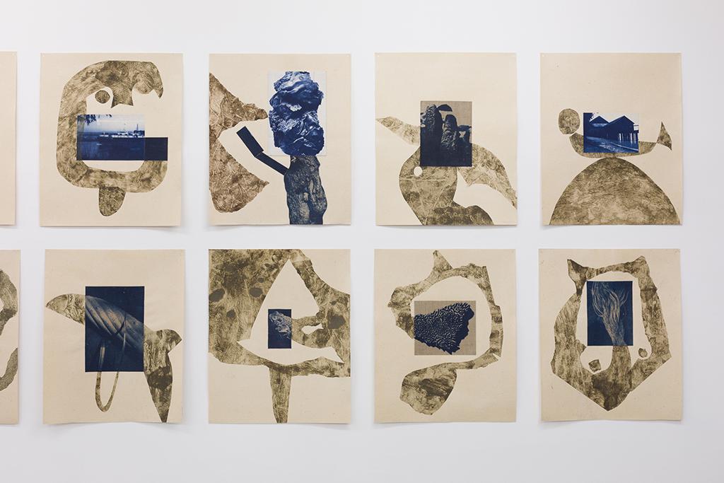 Liquid Mountains section view 4, 2016, cyanotype, clay and acrylic resin on canvas, approx. 18x22 inches x 24 pieces